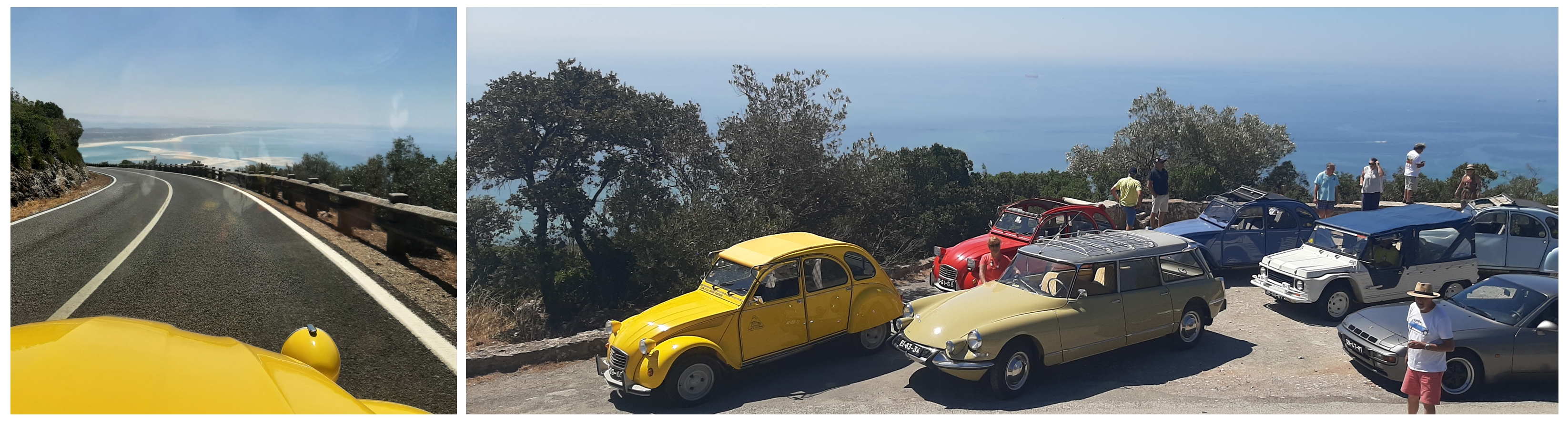 A restante caravana, continuou pela Aldeia de Irmãos, onde depois de uma sessão de “intervenção mecânica rápida” com o Diretor Urbano para meter outro 2CV a andar, lá fomos subindo a Serra, passando pelos usuais veraneantes e muitas motos que acediam às praias. No cimo, e já com as vistas deslumbrantes, fizemos uma paragem para apreciar a paisagem e todo o cenário, com direito a pequeno brinde de saúde ao Amarelinho e aos seus “irmãos de dia”!