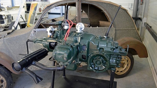 Equipado com um motor de dois cilindros opostos, refrigerado a ar, com 375 cc e 9 cv de potência (2 cv era a potência fiscal declarada), o 2CV era capaz de chegar aos 45 km/h, gastando apenas 4,5 litros aos 100 km.