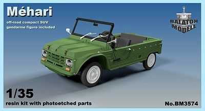 Entre os quais a versão do Méhari da série "Le gendarme " num quit para montar e pintar da Ballaton Modele, com o Méhari verde e o polícia.