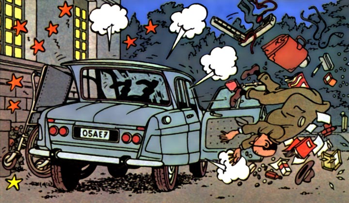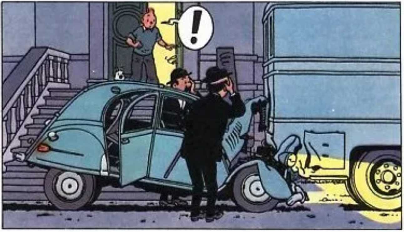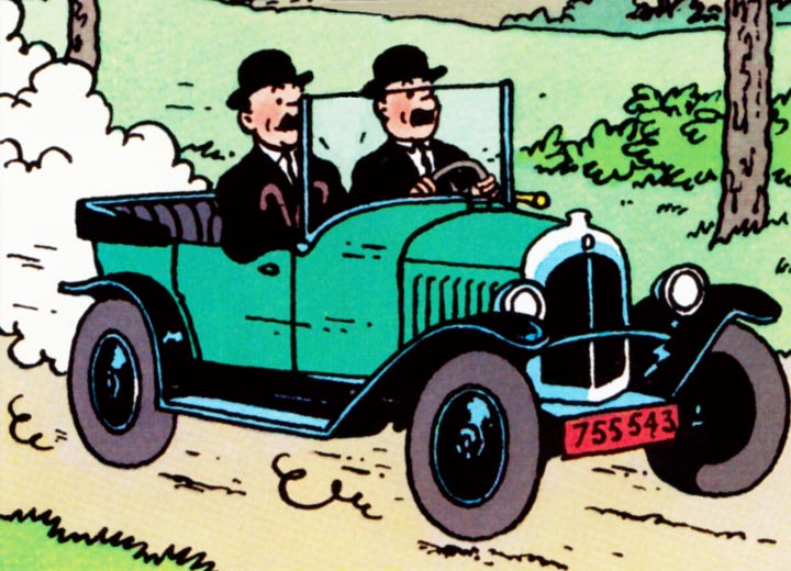 Reforça esta teoria o facto de, num dos livros seguintes, , o 2CV dos irmãos Dupont é novamente uma versão belga, muito reconhecível pelos seus indicadores nos para-lamas traseiros.